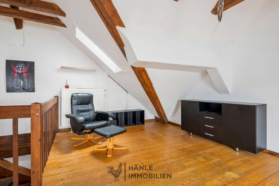 Sichtbare Holzbalken und die offene Raumwirkung verleihen diesem Bereich einen luftartigen Charakter und schaffen ein ganz besonderes Wohngefühl. Der Raum eignet sich ideal als Wohn- und Arbeitsbereich, Studio oder großzügiges Schlafzimmer.
