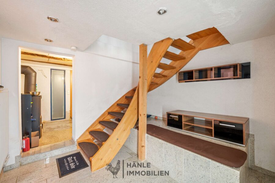 Die Wohnnutzung erstreckt sich über drei Ebenen. Teilweise sichtbare Holzbalken, Dielenböden sowie ein Kaminofen verleihen dem Haus einen individuellen gewachsenen, Charakter.